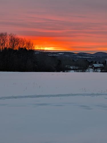 The swing back to warmer weather is slowly but surely underway. Nature is taking its cues from the sun’s return to the north; as you can see in the photo, the shift is dramatic. Back in late December, the sun rose well to the south, tucked to the right of the farm. Before long, that sunrise will move out of our direct view entirely until next fall.